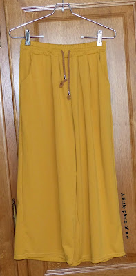 - Pantalón amarillo: creo que no se puede llegar a considerar palazzo, pero es igual de cómodo que los pantalones que tienen este corte. La tela es un poco más gruesa de lo que me imaginaba, pero no demasiado, por lo que es ideal para verano. La cintura es elástica, por lo que servirá para varias tallas. Se ven los cordones, que terminan en un par de abalorios, quizá le da un aire más casual, porque estilo deportivo no es (a pesar de que igual se asocia a cintura elástica con chándal).